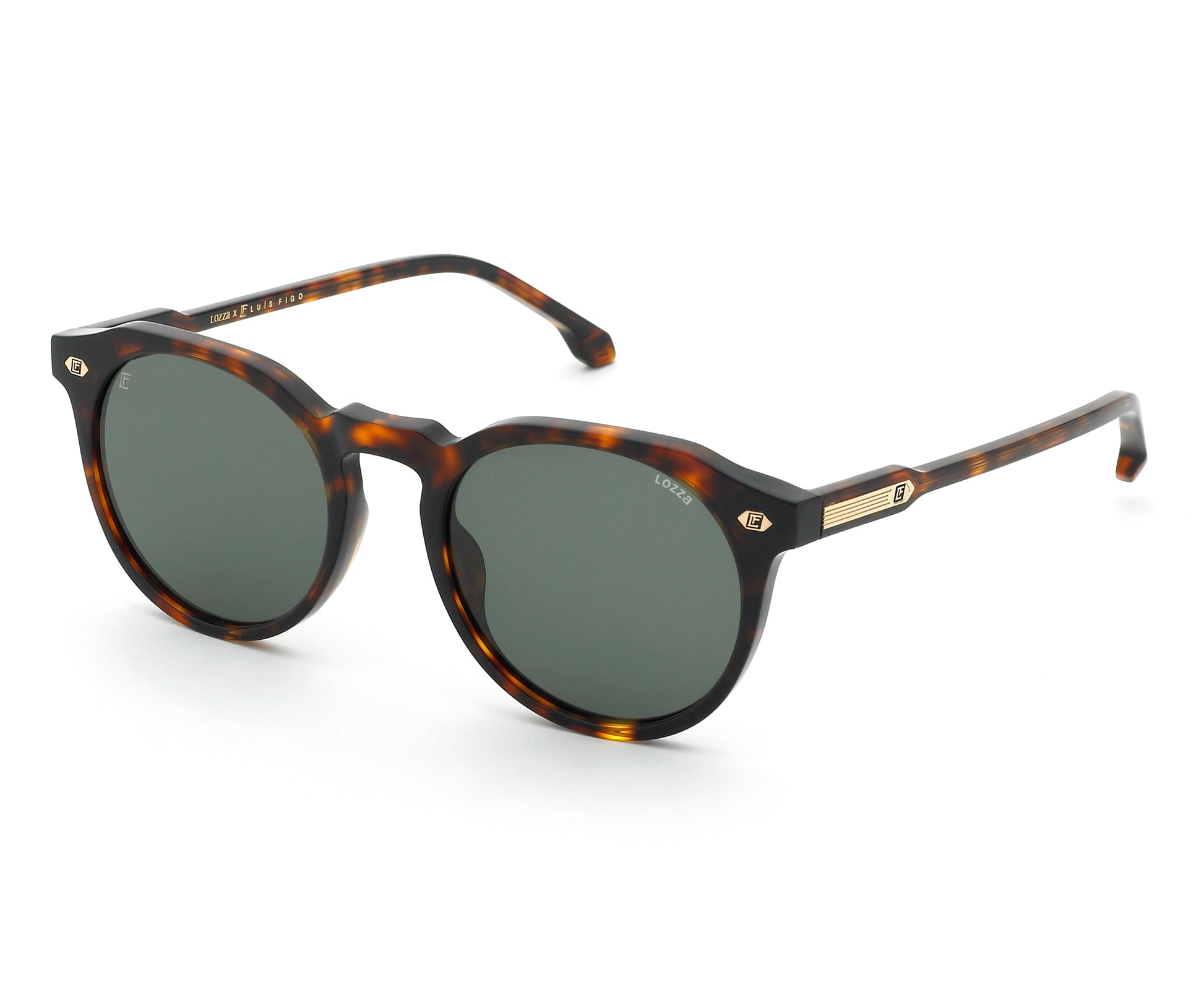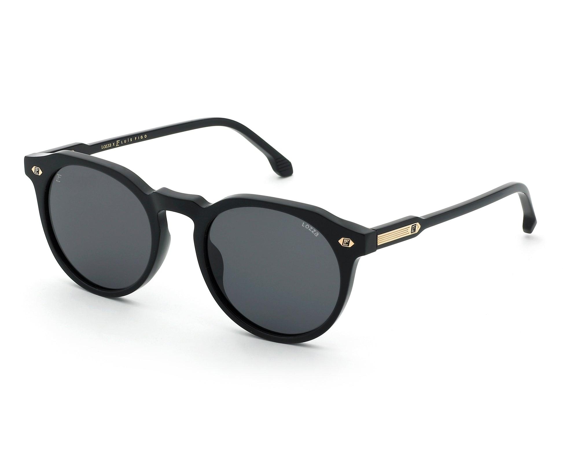 The lenses are customised with the LF and Lozza logos. In the translucent versions, the five-line metal core remains visible, while the 'Lozza x LF Luís Figo' engraving inside the left temple highlights the collaboration with the sporting icon.